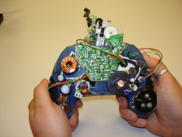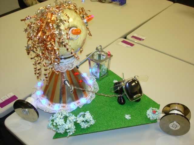 For this project at CU Boulder, students created artwork or toys using scrap electronics from multiple sources. Sources included dead CD players, disk drives, printers, scanners, telephones, and much miscellany. The source electronics were disassembled, and parts, including LEDs, chips, motors, belts and gears were repurposed into new works.
