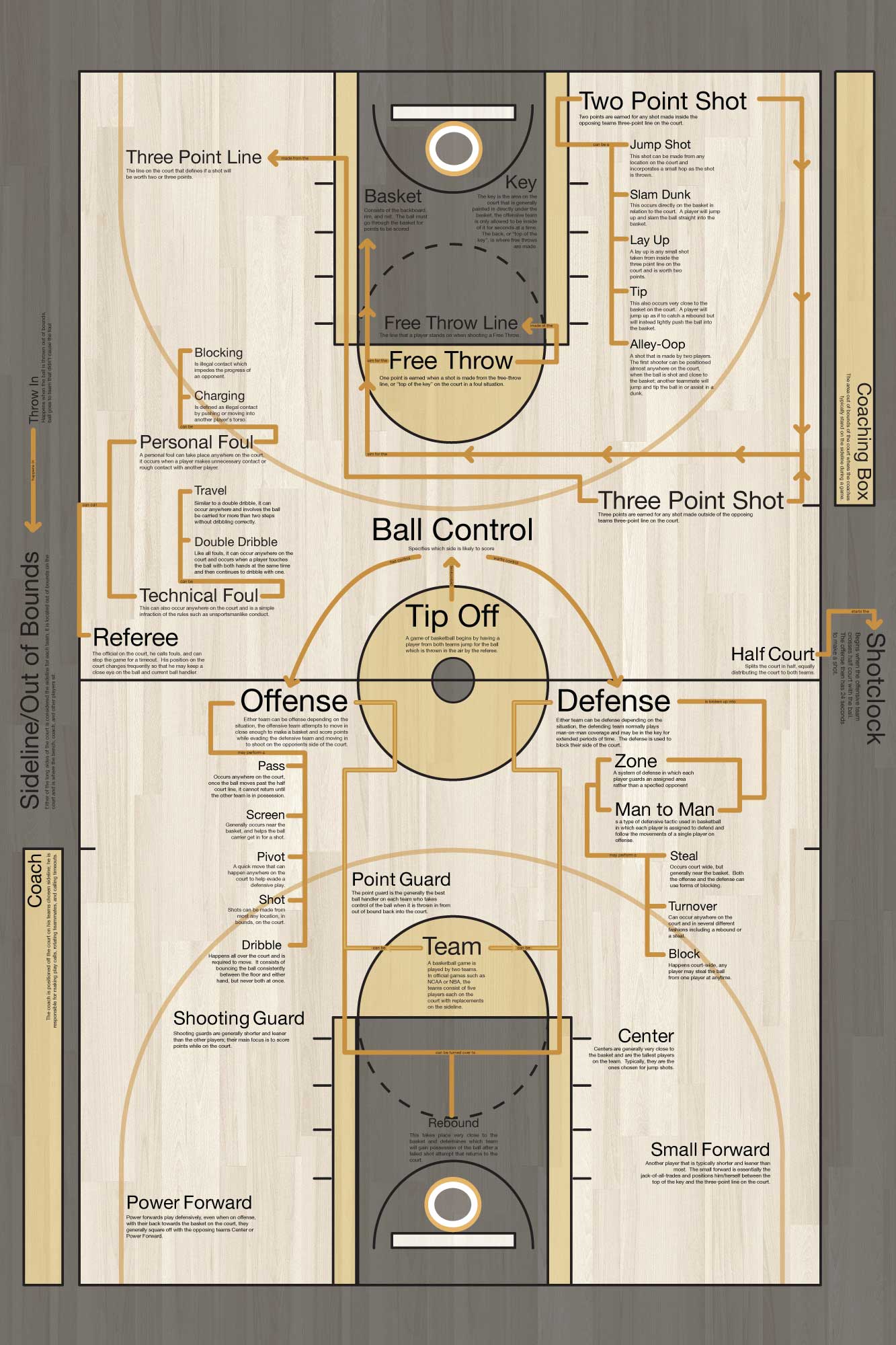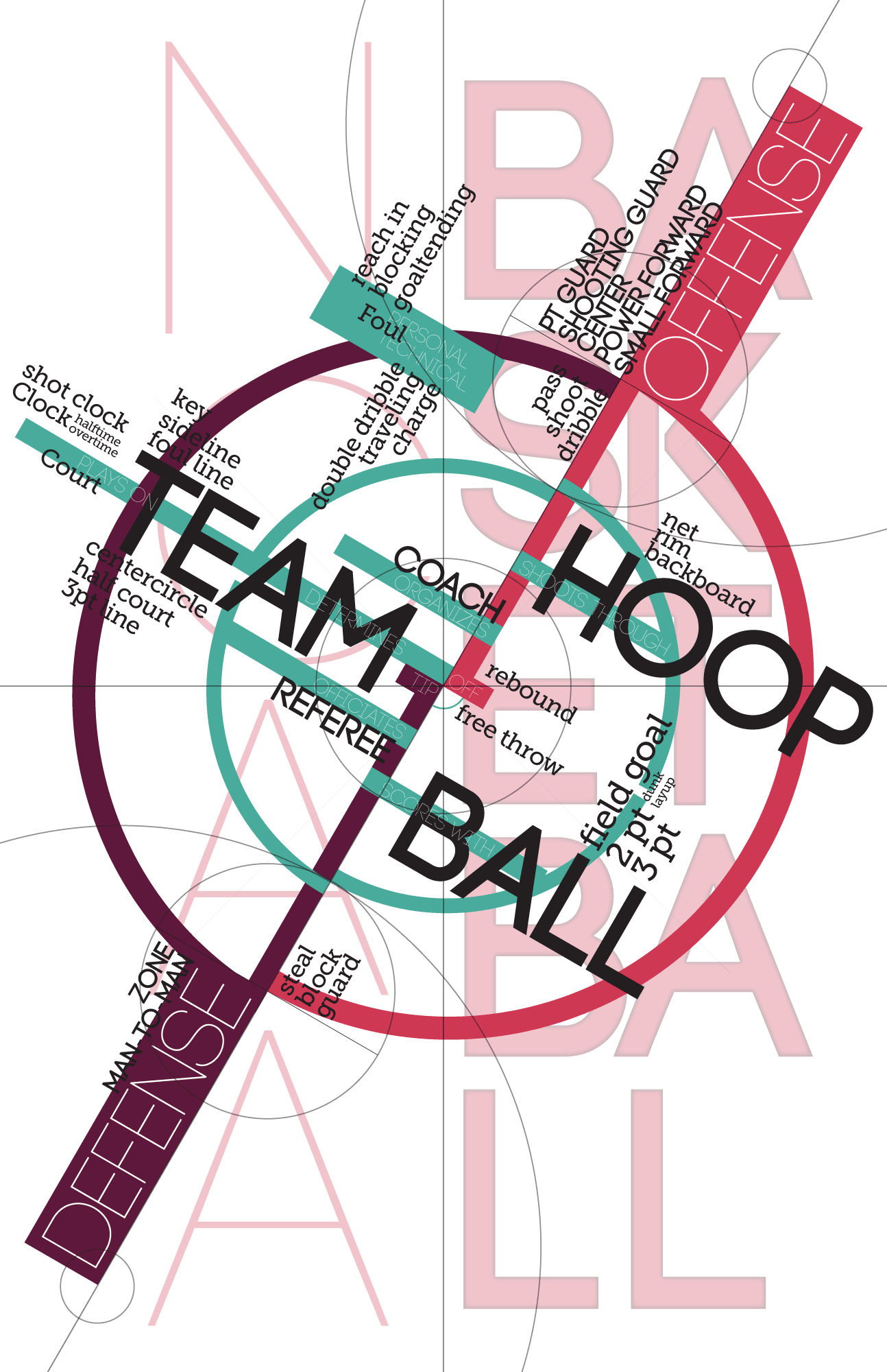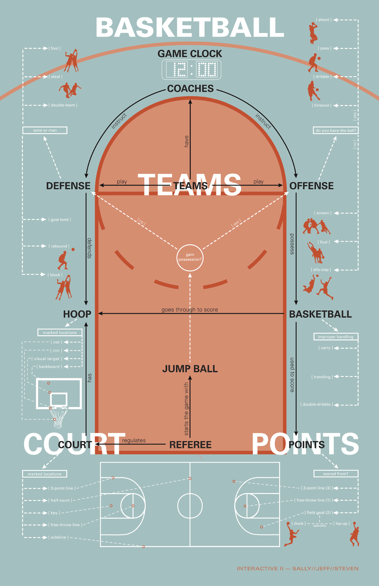 In this project, students created a model of basketball as a dynamic system. Students explored several ways to understand the system: as a class, students “played” basketball while documenting what they thought were the broadly understood conventions of the sport; students watched a basketball game, and documented the rules in-use; and students read the basketball rulebook, and created a list of terms, a list of processes, and a list of agents and objects that were governed by the rules. These lists were prioritized, and students explored several approaches to mapping: concept mapping, system flow diagrams, and types of hierarchical structures. The final result is based upon a ruleset established by each student team. The project was based upon a similar project by Hugh Dubberly.